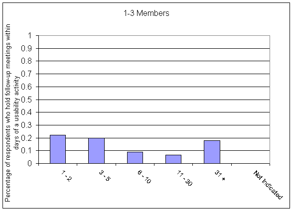 This graph indicates the percentage of the 45 of 100 survey respondents with a team consisting of 1-3 members in an organization and how many days after usability activities before a meeting is held to discuss results.