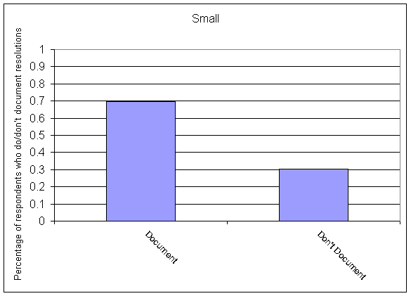 This graph indicates the percentage of the 33 of 100 survey respondents who indicated that they work in a small company (less than 400 employees) and document resolutions after usability activities.